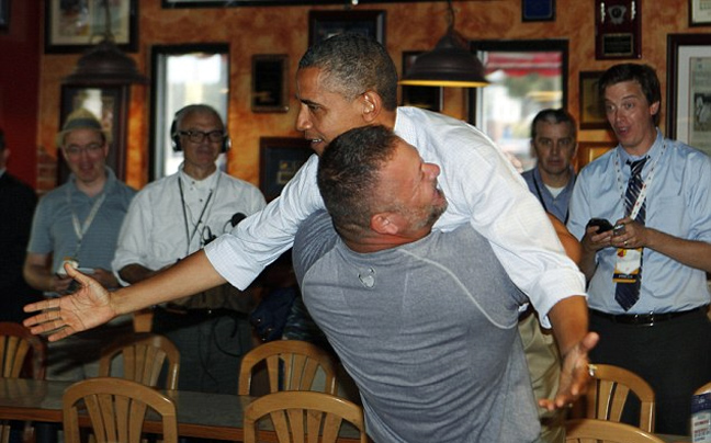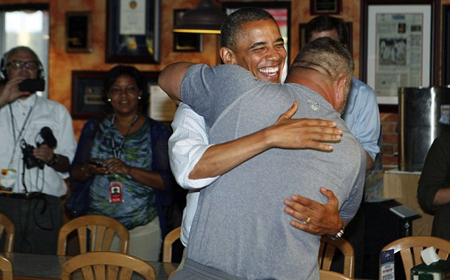 Ούτε ο Ομπάμα αλλά ούτε και οι άνθρωποι της ασφάλειάς του διέκοψαν αυτή την ξεχωριστή αγκαλιά, με τον οποία ο Βαν Ντούζερ έδειξε την υποστήριξή του στον πρόεδρο.