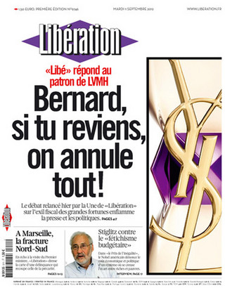 Απαράδεκτος και άκρας χυδαιότητας χαρακτηρίστηκε σήμερα από το γραφείο του Μπερνάρ Αρνό, του ιδιοκτήτη της αυτοκρατορίας ειδών πολυτελείας LVMH, το χθεσινό δημοσίευμα της Liberation με τίτλο «Αντε χάσου πλούσιε μ…!», με αποτέλεσμα ο Αρνό να καταθέσει μήνυση κατά της εφημερίδας.