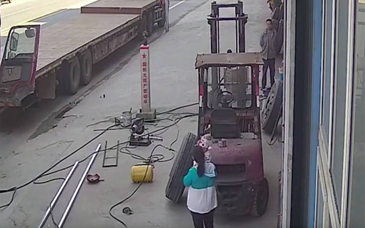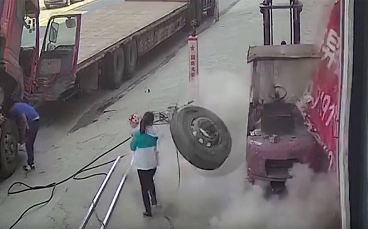 Το περιστατικό συνέβη σε γκαράζ αυτοκινήτων σε επαρχία της κεντρικής Κίνας. Η γυναίκα στεκόταν δίπλα στο λάστιχο, κρατώντας αγκαλιά το μωρό της, όταν ξαφνικά το λάστιχο εξερράγη, με αποτέλεσμα το μωρό να πεταχτεί μέτρα μακριά και εκείνη να πέσει στο έδαφος.