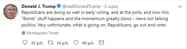Στο μεταξύ, ο Αμερικανός πρόεδρος Ντόναλντ Τραμπ έγραψε σήμερα στο Twitter ότι η ειδησεογραφική μετάδοση των ειδήσεων για τα ύποπτα πακέτα που είχαν στόχους υψηλόβαθμους πολιτικούς των Δημοκρατικών, αλλά και επικριτές του προέδρου, έχει μειώσει την προεκλογική δυναμική των υποψηφίων του Ρεπουμπλικανικού Κόμματος, για τις ενδιάμεσες εκλογές της 6ης Νοεμβρίου. «Οι Ρεπουμπλικάνοι τα πηγαίνουν τόσο καλά στην πρόωρη εκλογική διαδικασία, αλλά και στις δημοσκοπήσεις και τώρα αυτά τα γεγονότα για τις “Βόμβες” συμβαίνουν και η δυναμική μειώνεται -ειδήσεις που δεν αναφέρονται στην πολιτική. Είναι πολύ ατυχές αυτό που συμβαίνει», έγραψε ο Τραμπ στο Twitter.