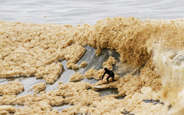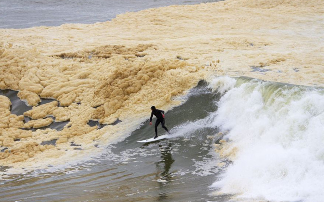 Τα σκουπίδια και ο κίτρινος αφρός τους δεν εμπόδισαν τρεις παράτολμους surfers από τη Νέα Ζηλανδία να πάρουν τις σανίδες τους και να πέσουν στα κύματα.