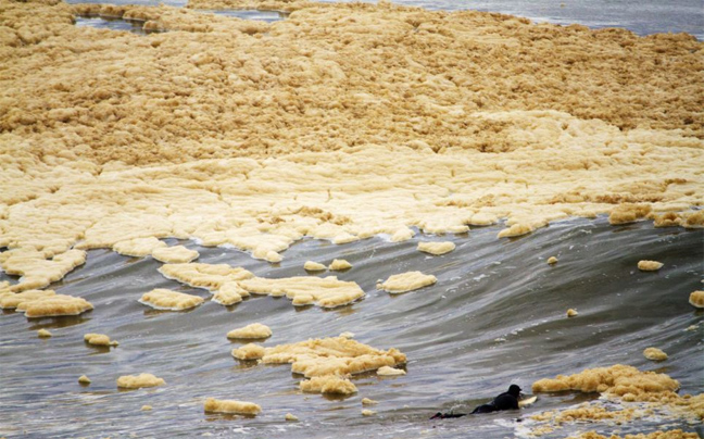 Το κίτρινο χρώμα του αφρού οφείλεται σε μία πλημμύρα που «έβγαλε» σκουπίδια και συντρίμμια του δρόμου τη θάλασσα.