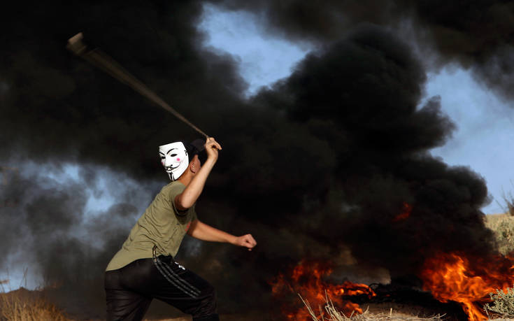 Ένας Παλαιστίνιος πετά πέτρες στα ισραηλινά στρατεύματα φορώντας μία μάσκα «V for Vendetta». Χωρίς τέλος οι συγκρούσεις στη Λωρίδα της Γάζας.