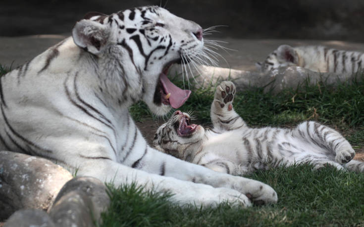 Η Clarita, η τίγρη της Βεγγάλης, παίζει με ένα από τα τρία της παιδιά στο ζωολογικό κήπο Huachipa, στα περίχωρα της Λίμα του Περού.
