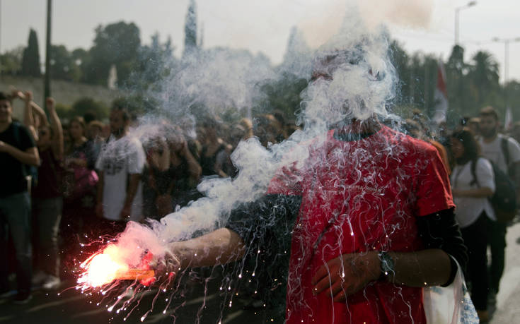 Ένας φοιτητής κρατά ένα καπνογόνο κατά τη διάρκεια διαδήλωσης που διοργάνωσαν οι φοιτητές στην Αθήνα.