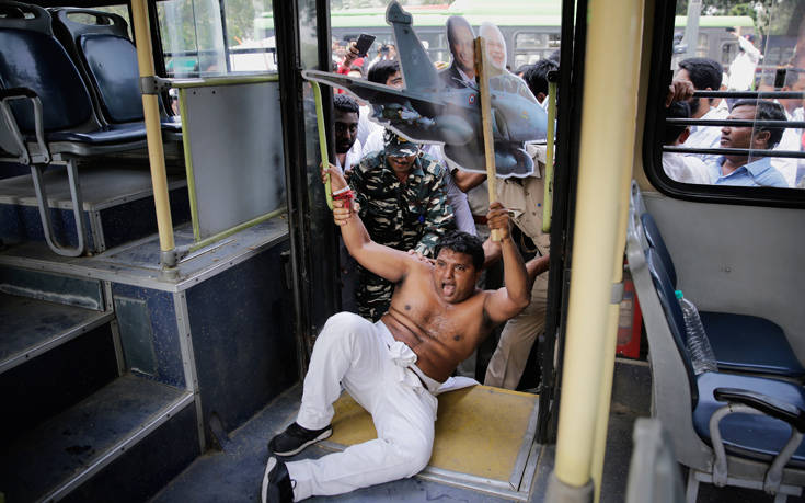 Ινδοί αστυνομικοί προσπαθούν να συλλάβουν έναν διαδηλωτή, κατά τη διάρκεια συγκέντρωσης κοντά στην επίσημη κατοικία του πρωθυπουργού της χώρας.