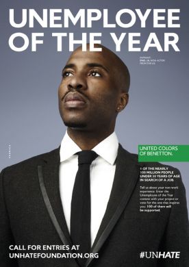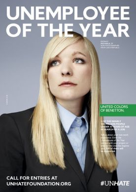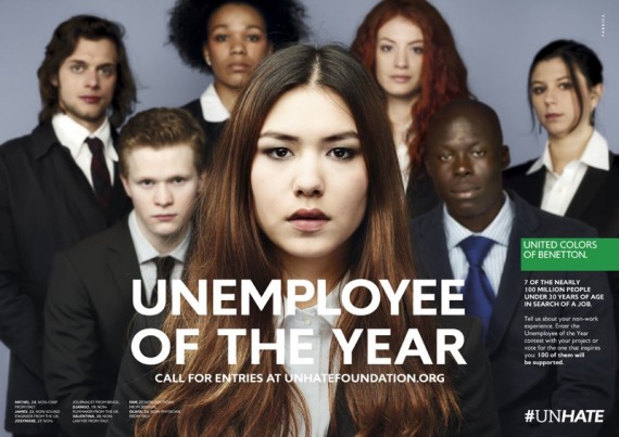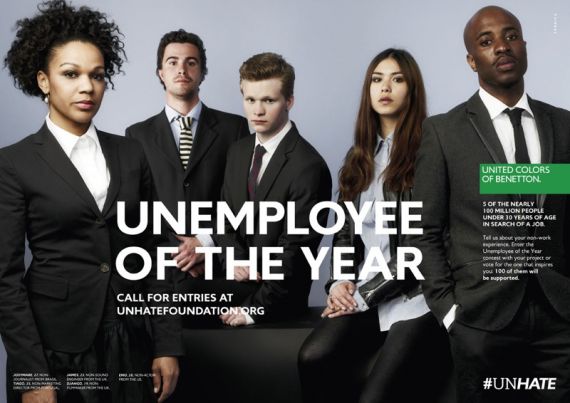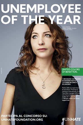 Η Benetton έκανε και πάλι το θαύμα της. Η ιταλική εταιρία ρούχων έκανε άλλη μία εξαιρετική καμπάνια, που «χτυπά» μία ευαίσθητη φλέβα της εποχής. Αυτή τη φορά το θέμα είχε να κάνει με την ανεργία. Η εταιρία έπαιξε με τις λέξεις employee (υπαλληλος) και unemployment (ανεργία). Τις συνδύασε και έφτιαξε το σλόγκαν unemployee of the year, το οποίο θα μπορούσε να μεταφραστεί ως (ο μη υπάλληλος της χρονιάς).