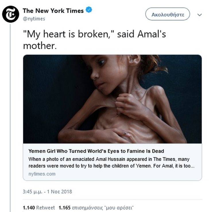 Η 7χρονη Άμαλ Χουσάιν, που έγινε σύμβολο της ανθρωπιστικής κρίσης στην εμπόλεμη Υεμένη μέσα από τον φωτογραφικό φακό του Τάιλερ Χικς, πέθανε χθες σύμφωνα με τους New York Times. Η Άμαλ πέθανε σε καταυλισμό προσφύγων στη χώρα χθες, ανέφερε η εφημερίδα. «Η καρδιά μου έχει ραγίσει. Η Άμαλ πάντα χαμογελούσε. Τώρα ανησυχώ και για τα άλλα μου παιδιά» δήλωσε η Μάριαμ Άλι, η μητέρα του κοριτσιού.