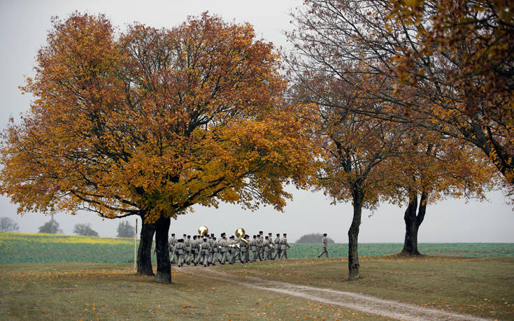 Γάλλοι στρατιώτες αποχωρούν μετά το τέλος των εορτασμών των 100 ετών από τον Πρώτο Παγκόσμιο Πόλεμο, στο Μοράνζ της ανατολικής Γαλλίας.