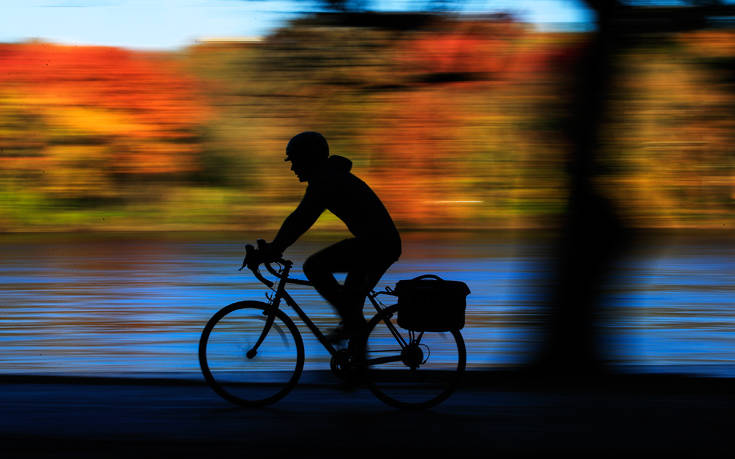 Ένας ποδηλάτης κάνει τη βόλτα του κατά μήκος του ποταμού Kelly Drive σε ένα φθινοπωρινό πρωινό στη Φιλαδέλφεια των ΗΠΑ.