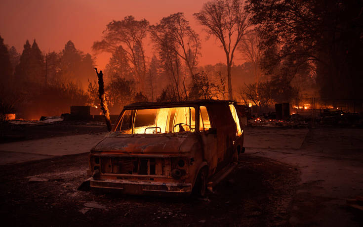 Φλόγες καίνε φορτηγό στο Paradise της Καλιφόρνια. Δεκάδες χιλιάδες άνθρωποι αναγκάστηκαν να εγκαταλείψουν τα σπίτια τους στο βόρεια τμήμα της Πολιτείας, καθώς η πυρκαγιά έκαιγε ανεξέλεγκτη.