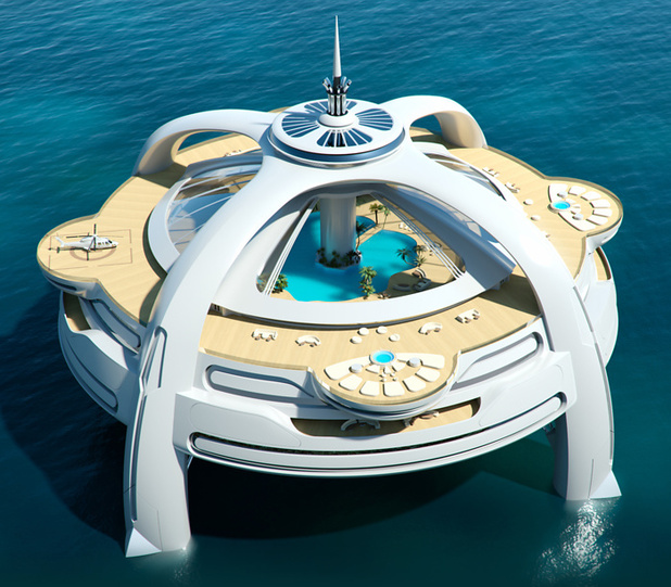 Όσο για τη «ναυαρχίδα» των εξωφρενικών γκάτζετ, δεν είναι άλλη από το φορητό νησί με διάμετρο 100 μέτρων, πισίνα, ξενοδοχείο και ελικοδρόμιο. Το υπέροχο αυτό νησί, που μπορεί να ταξιδεύει στις θάλασσες και να αράζει όπου θέλει ο ιδιοκτήτης του, γίνεται δικό σας με 140 εκατομμύρια ευρώ.