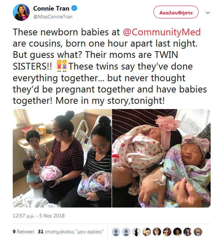 Δίδυμες αδελφές από την Καλιφόρνια υπολόγιζαν ότι θα γεννήσουν με δύο ημέρες διαφορά αλλά τελικά οι κόρες τους γεννήθηκαν την ίδια μέρα με μία ώρα διαφορά! Έτσι οι 23χρονες δίδυμες Bao Nhia Julia Yang and Bao Kou Julie Yang που γιορτάζουν μαζί τα γενέθλιά τους, τώρα θα γιορτάζουν μαζί και οι κόρες τους. «Άρχισα να πονάω και ήξερα ότι πρόκειται να γεννήσω. Το είπα στην αδερφή μου. Και εκείνη μου είπε πως είχε κάποια πονάκια και πως μπορεί να γεννήσει», δήλωσε η μία εκ των δύο στο δίκτυο KPGE, που συνεργάζεται με το CNNi.