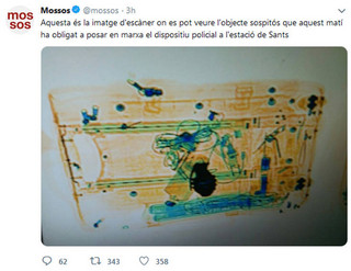 Μια γυναίκα που ταξίδευε από τη Βαρκελώνη στη Μαδρίτη και είχε στη βαλίτσα της μια αγκράφα ζώνης που έμοιαζε με πραγματική χειροβομβίδα προκάλεσε την εκκένωση των σιδηροδρομικών σταθμών της Μαδρίτης και της Βαρκελώνης, γνωστοποίησαν οι αρχές. Η αστυνομία της περιφέρειας της Καταλονίας, Mossos d’Esquadra, ενημερώθηκε από το προσωπικό ασφάλειας του σταθμού Σαντς της Βαρκελώνης πως «είχαν δει στον σαρωτή (σκάνερ) ένα αντικείμενο που θα μπορούσε να είναι ένα εκρηκτικό αντικείμενο», δήλωσε ένας εκπρόσωπος στο Γαλλικό Πρακτορείο. Στην πλειονότητα των ισπανικών σταθμών, οι επιβάτες θα πρέπει, όπως και στα αεροδρόμια, να περάσουν τις αποσκευές τους από σαρωτή, όπως αναφέρει το Αθηναϊκό Πρακτορείο Ειδήσεων. Φωτογραφία που αναρτήθηκε στον λογαριασμό της Mossos d’Esquadra στο Twitter δείχνει την εικόνα από τη σάρωση με σκάνερ μιας βαλίτσας στην οποία φαίνεται ένα αντικείμενο που μοιάζει πραγματικά με χειροβομβίδα, με την περόνη να διακρίνεται καθαρά.