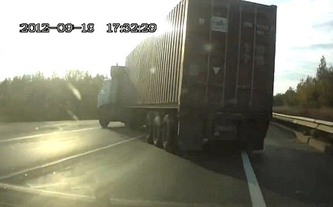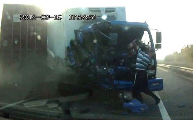 Άγιο είχε ένας ρώσος οδηγός φορτηγού στη Βρετανία όταν το όχημά του προσέκρουσε σε ένα άλλο φορτηγό και ο ίδιος εκτοξεύτηκε από το παρμπρίζ, χωρίς να πάθει τίποτα!