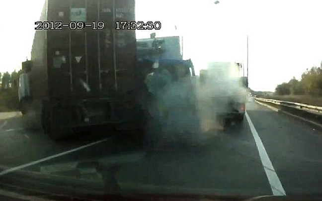 Στο βίντεο που ακολουθεί φαίνεται η πρόσκρουση του φορτηγού και ο οδηγός του να σπάει το τζάμι και να προσγειώνεται στα δόντια του πόδια, με γυαλιά και λαμαρίνες να εκτοξεύονται στον αέρα! Ο οδηγός δεν φορούσε ζώνη ασφαλείας και αυτή είναι πιθανόν μια από τις σπάνιες περιπτώσεις που η μη χρήση του προστατευτικού μέσου λειτούργησε προς όφελος του οδηγού!
