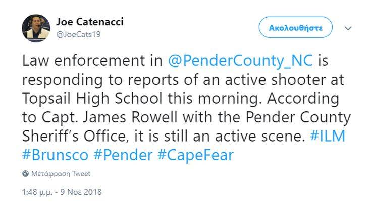 Αστυνομική επιχείρηση βρίσκεται σε εξέλιξη στη Βόρεια Καρολίνα μετά από αναφορές για έναν ένοπλο στο σχολείο Topsail High School.
