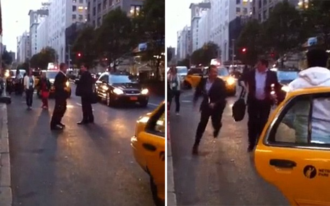 Οι δύο άνδρες τσακώνονται και τρέχουν προς το ταξί ενώ ο οδηγός βγαίνει από το όχημά του και προσπαθεί μάταια να τους χωρίσει.