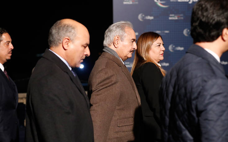 Ο Χάφταρ έφθασε αεροπορικώς στη διάσκεψη χθες, Δευτέρα, το βράδυ και πραγματοποιεί συναντήσεις στο περιθώριό της, παρά το γεγονός ότι είπε πως δεν θα συμμετάσχει. Σε φωτογραφία εικονίζεται να συναντά τον Σάρατζ παρουσία του Ιταλού πρωθυπουργού Τζουζέπε Κόντε.