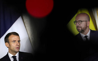 Ο Γάλλος Πρόεδρος Εμανουέλ Μακρόν μιλάει σε κοινή συνέντευξη Τύπου με τον Βέλγο πρωθυπουργό, Σαρλ Μισέλ και ο φακός κάνει το δικό του παιχνίδι.