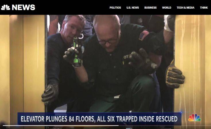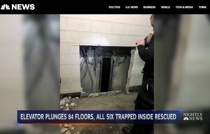 Τρομακτικές στιγμές έζησαν οι 6 άνθρωποι που βρέθηκαν μέσα σε ένα ασανσέρ το οποίο πραγματοποίησε βουτιά 84 ορόφων. όταν κόπηκε ένα από το συρματόσχοινο, με αποτέλεσμα να εγκλωβιστούν έξι άνθρωποι, ανάμεσά τους και μία έγκυος.