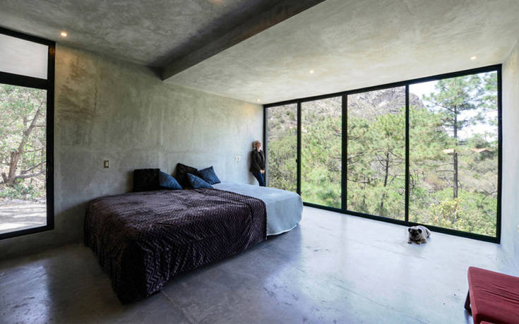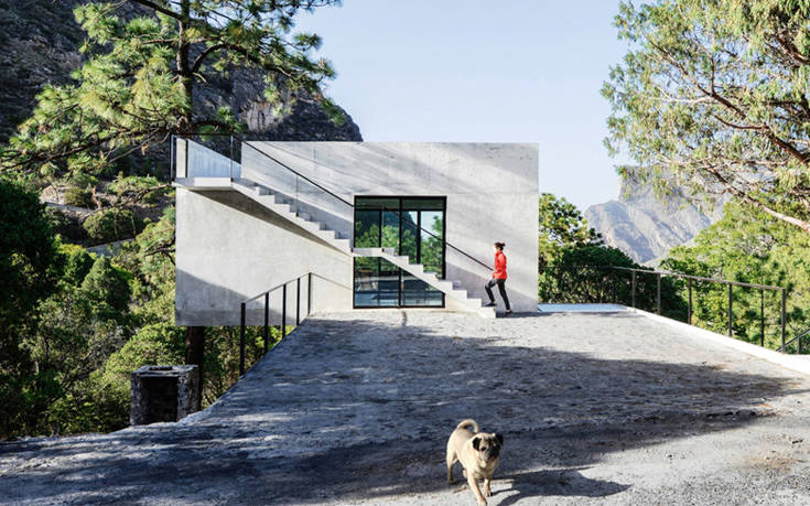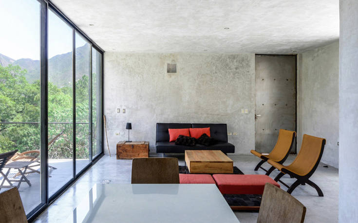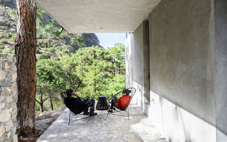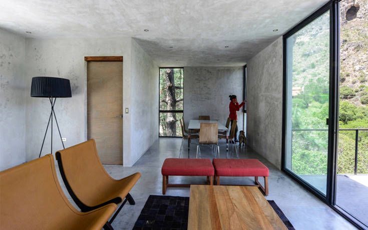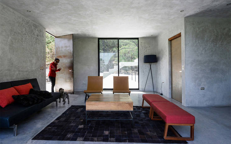 Όσο για το εσωτερικό, το μπετό έχει μείνει γυμνό, αποκαλύπτοντας μια μινιμαλιστική παλέτα που χαρίζει γενναίες ματιές στο πράσινο.