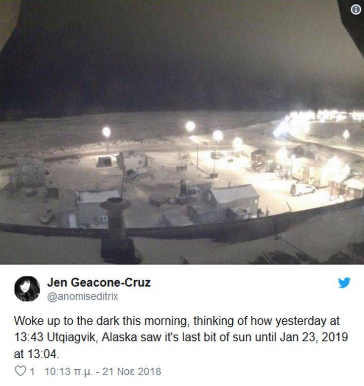 Οι κάτοικοι του Utqiagvik πάντως θα έχουν την τύχη να ξαναδούν τον ήλιο στις 23 Ιανουαρίου του επόμενου έτους.