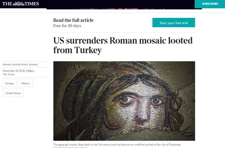 Τα κομμάτια ενός διάσημου ρωμαϊκού μωσαϊκού που λεηλατήθηκαν και τελικά πωλήθηκαν σε ένα αμερικανικό πανεπιστήμιο πρόκειται να επιστραφούν στην Τουρκία γράφουν οι Times του Λονδίνου. Τα δώδεκα τμήματα του μωσαϊκού βρέθηκαν στον αρχαίο ρωμαϊκό οικισμό του Zeugma, κοντά στη σύγχρονη τουρκική πόλη Gaziantep και απεικονίζουν ανθρώπινα πρόσωπα και πουλιά.
