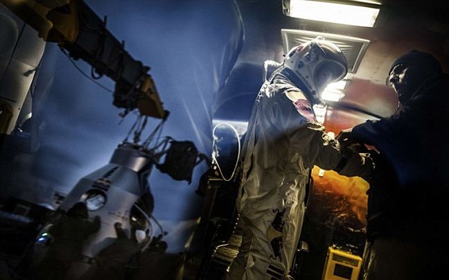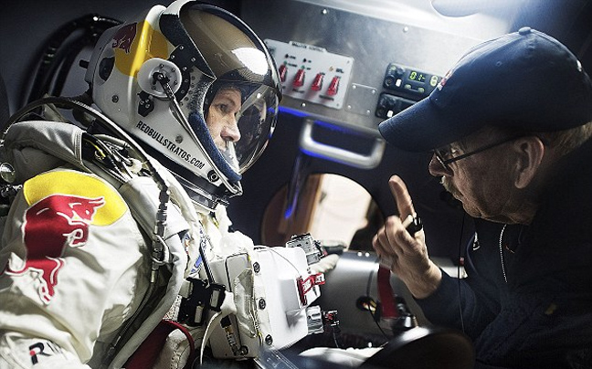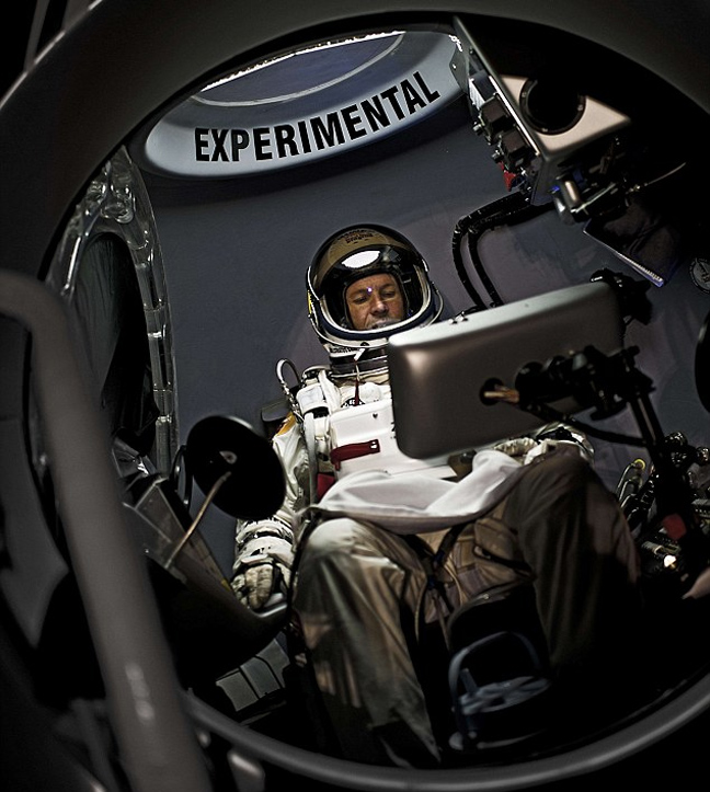 Ο Baumgartner τσέκαρε τις τεχνικές λεπτομέρειες στην κάψουλα πριν φορέσει την ειδικά κατασκευασμένη στολή του, κόστους 200.000 δολαρίων.