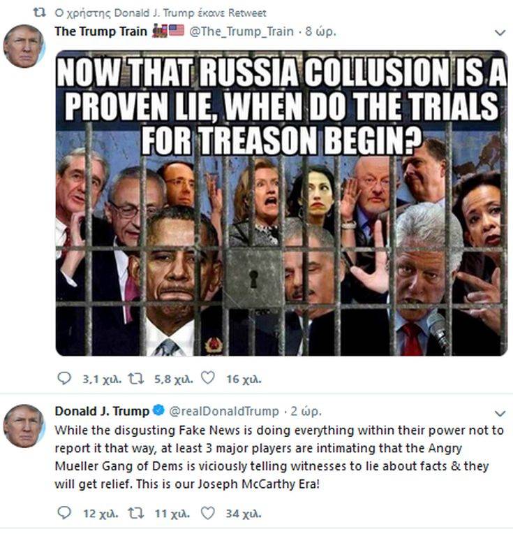 O πρόεδρος των ΗΠΑ Ντόναλντ Τραμπ έγραψε ή προώθησε σήμερα στο αγαπημένο του μέσο κοινωνικής δικτύωσης, το Twitter, μια σειρά μηνυμάτων που στοχοθετούσαν τον ειδικό εισαγγελέα Ρόμπερτ Μάλερ, τον Μπαράκ Ομπάμα και το ζεύγος Κλίντον.