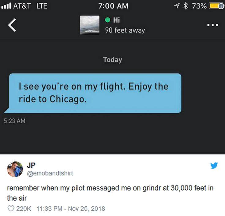 Τον περασμένο Αύγουστο, ο JP Thorn ταξίδεψε με την αεροπορική εταιρεία Delta από την πρωτεύουσα της Μινεσότα, Σεντ Πολ με προορισμό το Σικάγο στις ΗΠΑ. Όταν το αεροσκάφος προσγειώθηκε, ο 27χρονος φοιτητής άνοιξε το κινητό του και διαπίστωσε πως είχε μήνυμα στο Grindr, μια εφαρμογή γνωριμιών για γκέι, από ένα άτομο που βρισκόταν εντός αεροπλάνου.