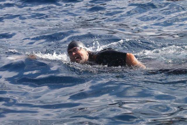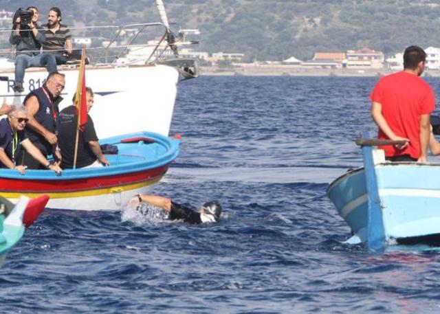 Ο Γκρίλο, 64 ετών, κολύμπησε υπό βροχή την απόσταση των περίπου 3 χιλιομέτρων σε περίπου μία ώρα, ενώ πολλά μικρά σκάφη στα οποία επέβαιναν δημοσιογράφοι τον ακολουθούσαν.