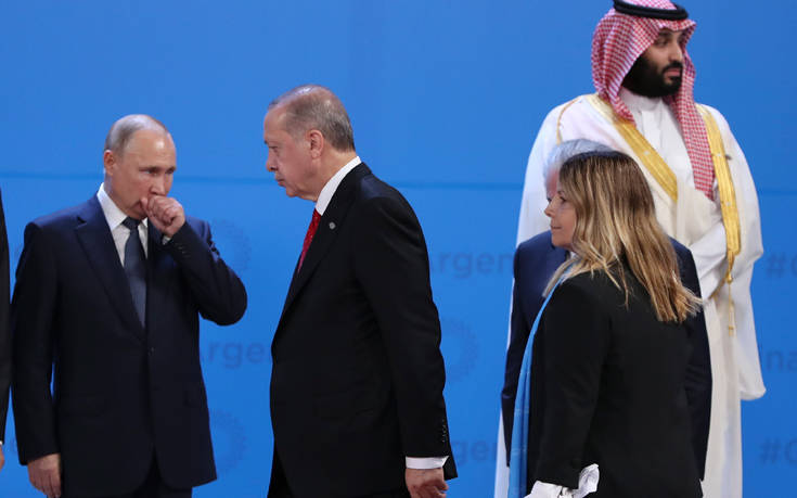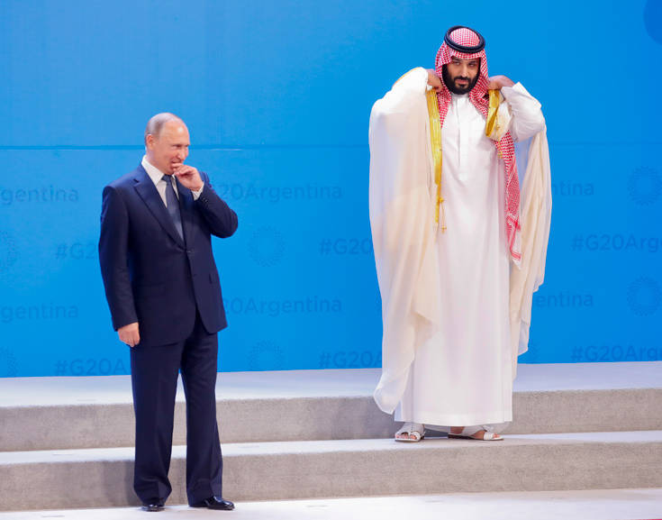 Αργότερα, ο πρόεδρος της Ρωσίας Βλαντίμιρ Πούτιν και ο πρίγκιπας Μοχάμεντ έκαναν «κόλλα πέντε» κι αντήλλαξαν μια χειραψία, ενώ γελούσαν δυνατά την ώρα που κάθονταν ο ένας δίπλα στον άλλο στην κεντρική αίθουσα συνεδριάσεων.