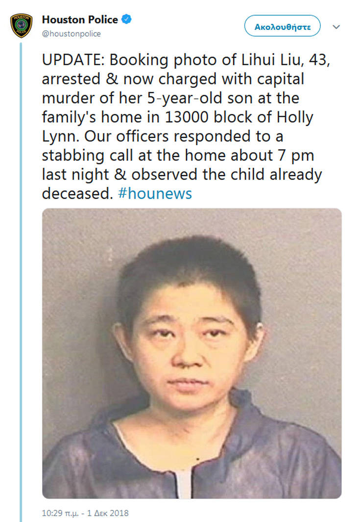 Δεν χωρά ανθρώπινος νους τα όσα φρικιαστικά έκανε μια μητέρα από το Τέξας στον 5χρονο γιο της. Σύμφωνα με την αστυνομία του Χιούστον, η 43χρονη Lihui Liu, έπνιξε το μικρό αγόρι και αφού το αποκεφάλισε, πέταξε τη σορό του σε σκουπιδοτενεκέ!