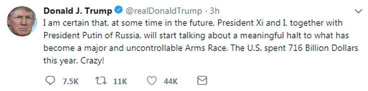 «Είμαι βέβαιος ότι, στο μέλλον, ο πρόεδρος Σι και εγώ ο ίδιος, μαζί με τον πρόεδρο Πούτιν, θα αρχίσουμε να μιλάμε για μια ουσιαστική διακοπή αυτού που έχει γίνει μια τεράστια και ανεξέλεγκτη κούρσα εξοπλισμών» έγραψε στο Twitter ο επικεφαλής του αμερικανικού κράτους, δύο ημέρες μετά τη συνάντησή του με τον Κινέζο ηγέτη στο Μπουένος Άιρες, στο περιθώριο της Συνόδου της G20.