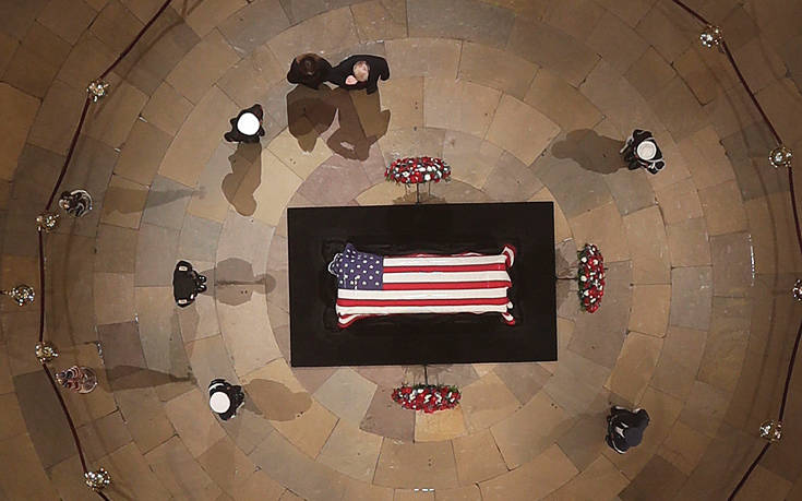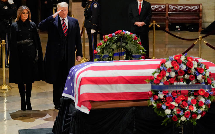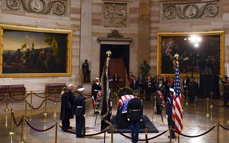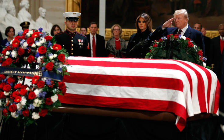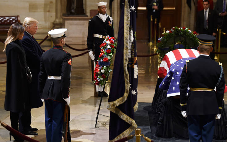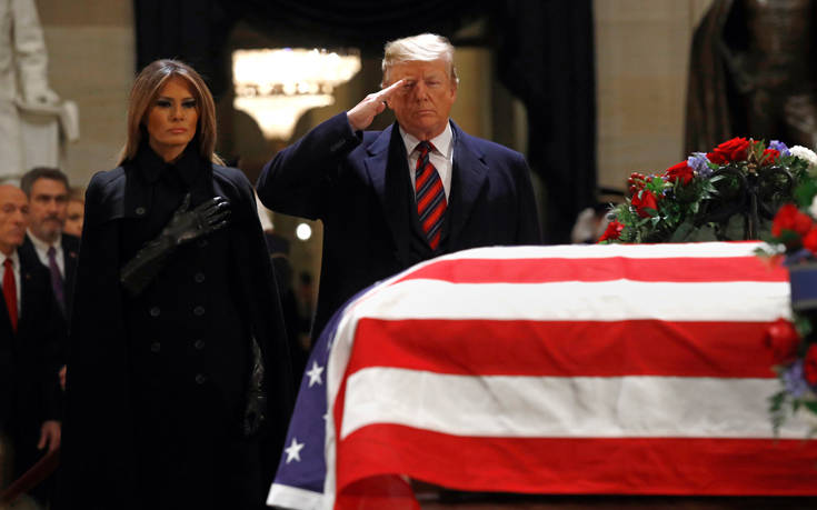 Φόρο τιμής στον εκλιπόντα πρώην πρόεδρο τον ΗΠΑ Τζορτζ Μπους τον πρεσβύτερο απέτισαν ο νυν πρόεδρος Ντόναλντ Τραμπ και η σύζυγός του Μελάνια, καθώς η σορός βρίσκεται στο αμερικανικό Καπιτώλιο, όπου εκτίθεται σε λαϊκό προσκύνημα έως και αύριο.