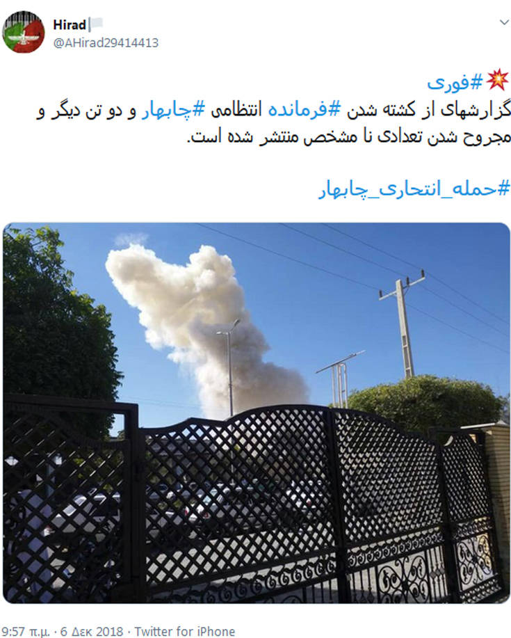 Τουλάχιστον 4 άνθρωποι σκοτώθηκαν και αρκετοί τραυματίστηκαν μετά από έκρηξη κοντά στο αρχηγείο της αστυνομίας στο λιμάνι του νοτιοανατολικού Ιράν Τσαμπαχάρ, όπως αναφέρουν Μέσα ενημέρωσης της χώρας.