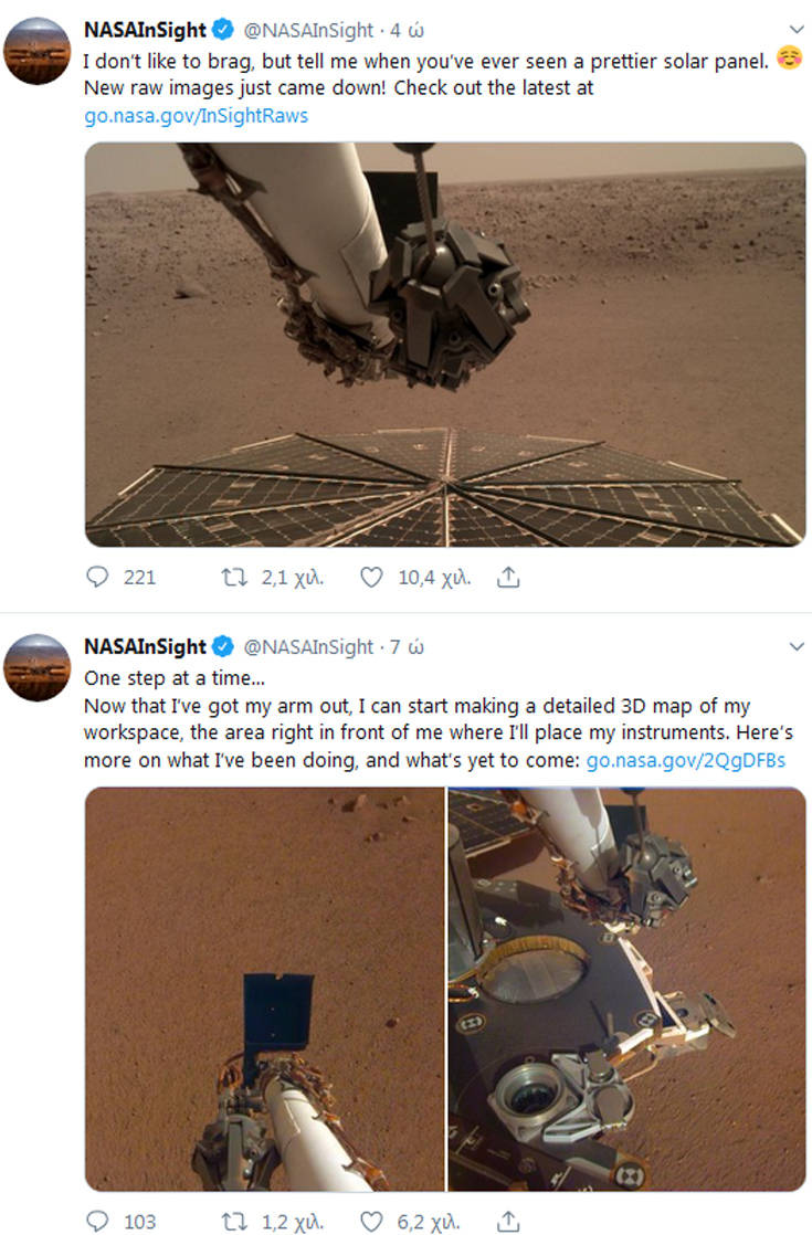 Τις φωτογραφίες τράβηξε ο ρομποτικός βραχίονας του InSight που έχει μήκος 2 μέτρων προκειμένου να δώσει στους επιστήμονες μια εικόνα του εδάφους στο οποίο έχει προσγειωθεί.
