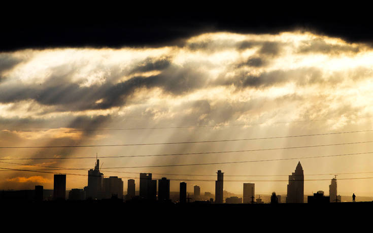 Οι ακτίνες του ήλιου παίζουν το δικό τους παιχνίδι με τα σύννεφα στη Φρανκφούρτη της Γερμανίας.