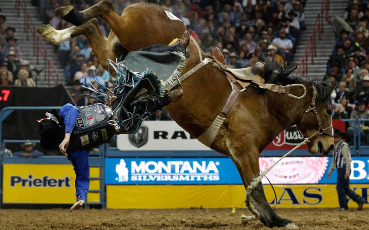 Ο Ryder Wright πέφτει από το άλογό του, κατά τη διάρκεια του έβδομου γύρου του τελικού Rodeo στο Λας Βέγκας.