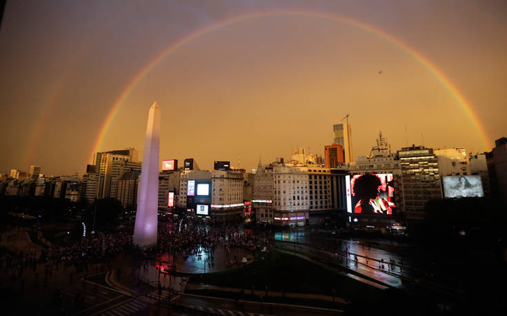 Ένα διπλό ουράνιο τόξο εμφανίζεται πάνω από το κέντρο του Obelisk, όπου οι οπαδοί της River Plate γιορτάζουν την κατάκτηση του Κόπα Λιμπερταδόρες μετά τη νίκη της ομάδας τους επί της Boca Juniors με 3-1 στη Μαδρίτη.