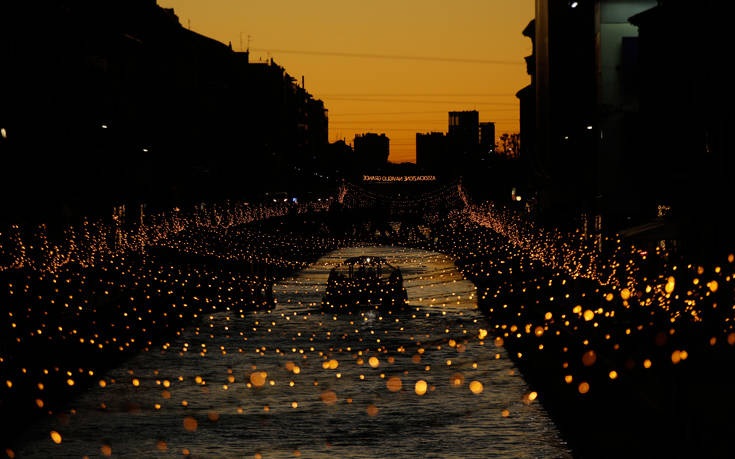 Ένα μικρό σκάφος πλέει κατά μήκος του καναλιού Naviglio, στο χριστουγεννιάτικο Μιλάνο της Ιταλίας.