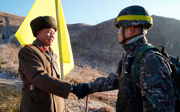 Αξιωματικός του στρατού της Βόρειας Κορέας συναντάται με αξιωματικό της Νότιας Κορέας, πριν διασχίσει τη στρατιωτική γραμμή διαχωρισμού εντός της αποστρατιωτικοποιημένης ζώνης των διακορεατικών συνόρων.