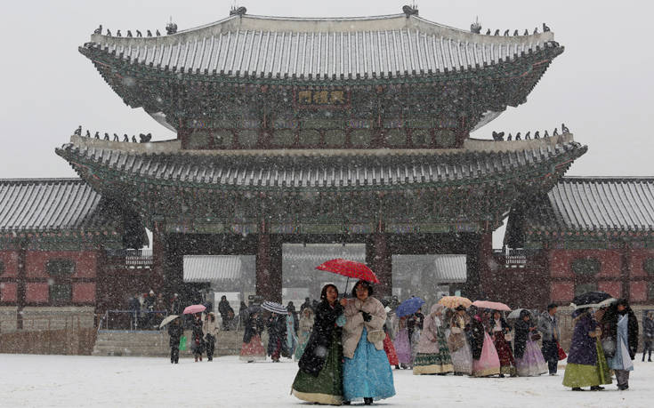 Τουρίστες κρατούν ομπρέλες απολαμβάνοντας το χιόνι στο βασιλικό παλάτι Gyeongbok, ένα από τα γνωστά αξιοθέατα της Νότιας Κορέας.
