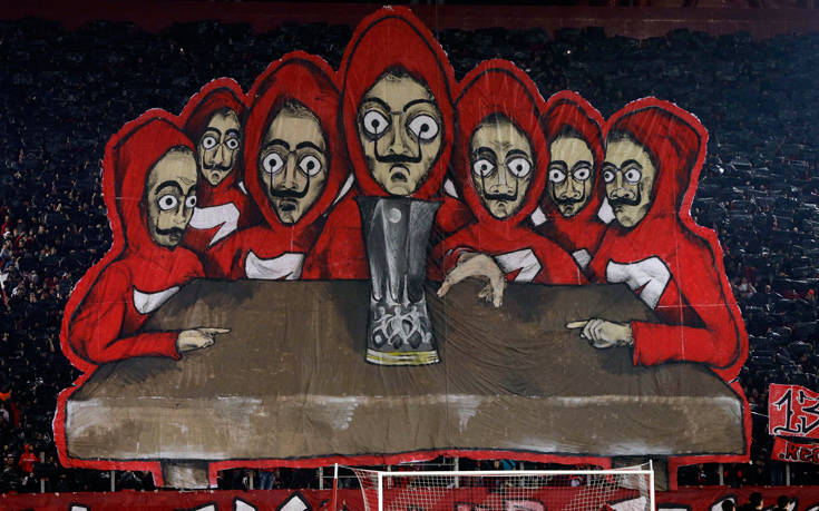 Οι φίλοι του Ολυμπιακού ετοίμασαν ένα όμορφο coreo πριν τη σέντρα του ματς με τη Μίλαν και το οποίο ήταν εμπνευσμένο από την πασίγνωστη σειρά «Casa de Papel».