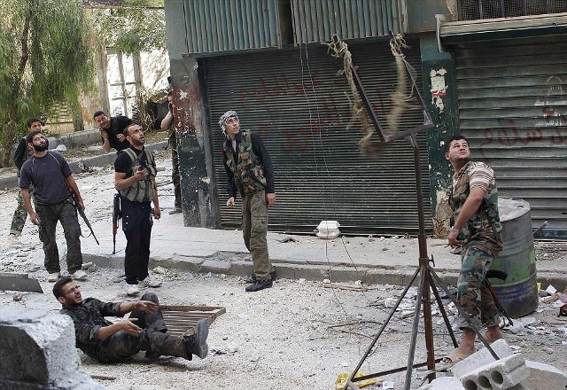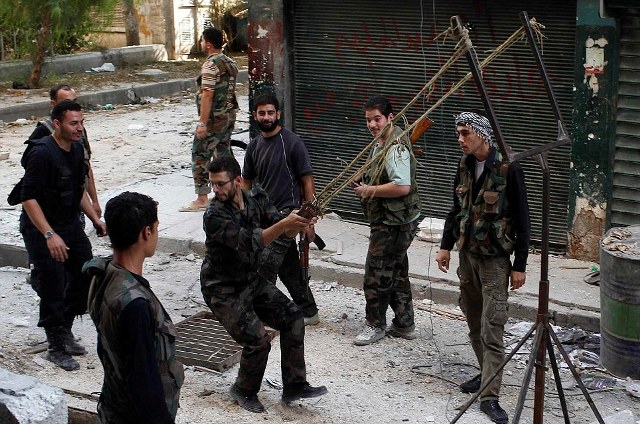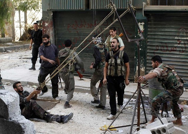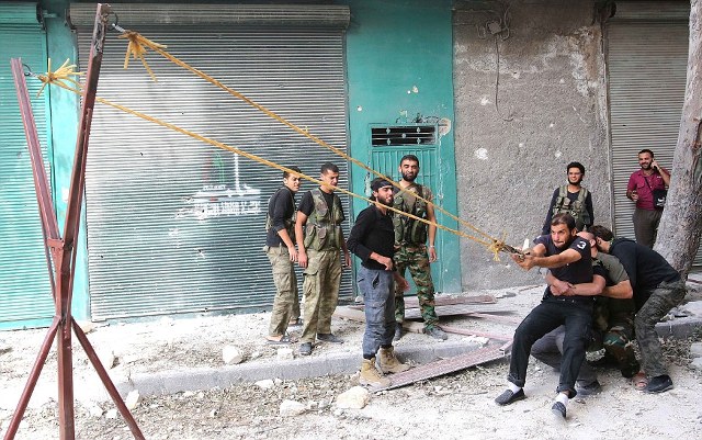 Μια ομάδα σύρων ανταρτών χρησιμοποιεί έναν «χειροποίητο» καταπέλτη για να εκσφενδονίσει βόμβες στις δυνάμεις ασφαλείας του προέδρου Άσαντ.