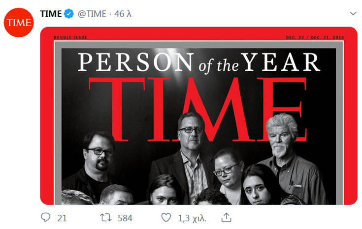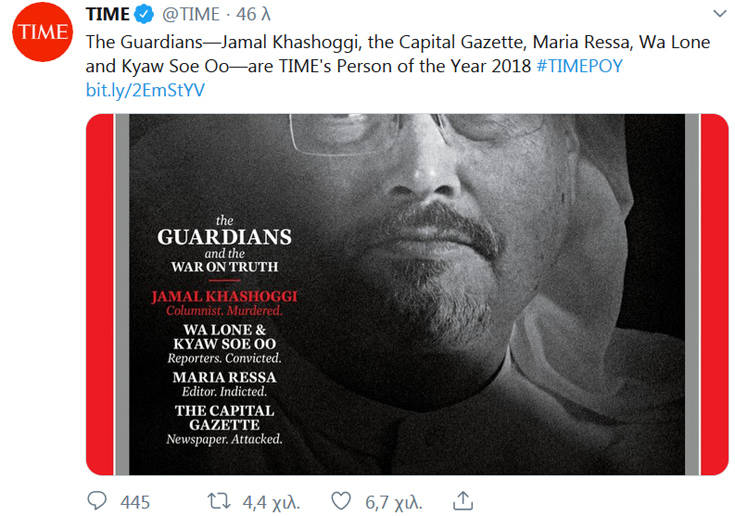 Ο Σαουδάραβας δημοσιογράφος Τζαμάλ Κασόγκι, ο οποίος φονεύθηκε στις 2 Οκτωβρίου στο προξενείο της Σαουδικής Αραβίας στην Κωνσταντινούπολη, επελέγη σήμερα ως προσωπικότητα της χρονιάς από το αμερικανικό περιοδικό Time, μια διάκριση την οποία μοιράζεται και με άλλους δημοσιογράφους.