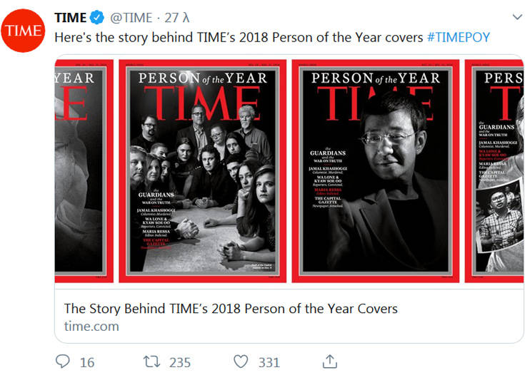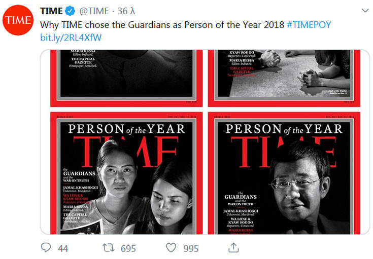 Όπως αναφέρει το Αθηναϊκό Πρακτορείο, εκτός από τον Τζαμάλ Κασόγκι, το εβδομαδιαίο περιοδικό τίμησε ως προσωπικότητες της χρονιάς τη Φιλιππινέζα δημοσιογράφο Μαρία Ρέσα, τους δύο Βιρμανούς ρεπόρτερ του πρακτορείου Ρόιτερ Ουά Λόουν και Κέι Σου Όου, που βρίσκονται αυτή τη στιγμή στη φυλακή, καθώς και τη σύνταξη της αμερικανικής τοπικής εφημερίδας Capital Gazette, πέντε μέλη της οποίας έχασαν τη ζωή τους στη διάρκεια επίθεσης που πραγματοποιήθηκε στις 28 Ιουνίου στην Ανάπολη της Πολιτείας του Μέριλαντ.
