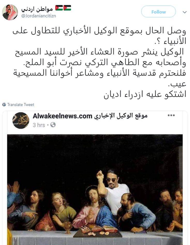 Ο ελ Ουακίλ και η συνεργάτιδά του τέθηκαν υπό κράτηση την Δευτέρα. Πρόσφατα, η εφημερίδα δημοσίευσε στη σελίδα της στο Facebook ένα φωτομοντάζ του διάσημου Μυστικού Δείπνου του Λεοντάρντο Ντα Βίντσι: στον πίνακα, όρθιος πλάι στον Χριστό, εικονιζόταν ένας γνωστός Τούρκος σεφ, ο Νουσρέτ Γκιοτσέ (Salt Bae), να… αλατίζει ένα κομμάτι κρέας. Στη γάμπα ενός από τους Αποστόλους διακρινόταν επίσης ένα… τατουάζ, το πρόσωπο του Ιησού.