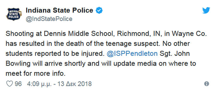 Νέο αιματηρό περιστατικό σε σχολείο των ΗΠΑ, αυτή τη φορά στην πόλη Ρίτσμοντ της Ιντιάνα. Το σχολείο «Dennis Intermediate School», όπου άγνωστος άρχισε να πυροβολεί, βρίσκεται σε κατάσταση συναγερμού.